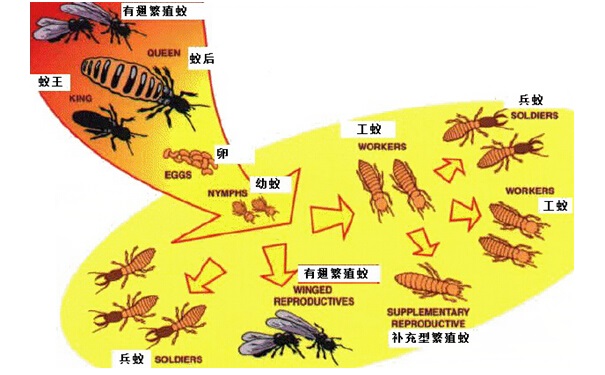白蟻的種類有很多種,中國已知有白蟻4科、47屬、480多種,國內(nèi)28個?。ㄊ?、自治區(qū))均有分布。其中危害較嚴重的有土木棲的鼻白蟻科乳白蟻屬的家白蟻(臺灣乳白蟻)、散白蟻、土棲的黑翅大白蟻、堆砂白蟻、黃胸散白蟻等,對房屋建筑危害最嚴重的是家白蟻。